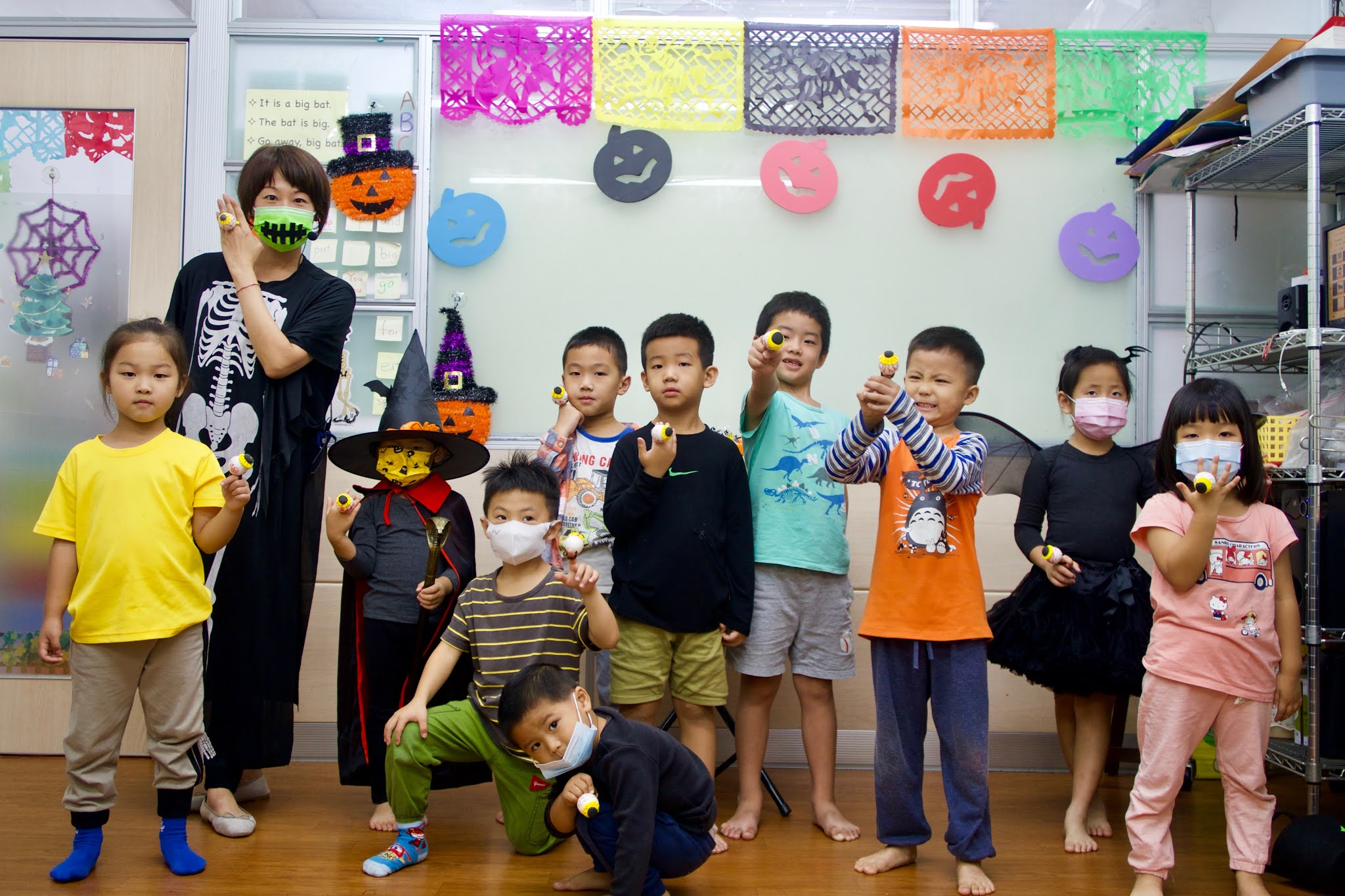 今天剛好是西洋萬聖節,我們一起聽故事,孩子們真的很專注聽故事,找書裡的細節. 一起做應景的眼球戒指.