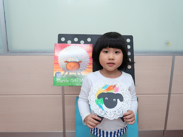 孩子們在聽Marvin Gets Mad 的時候,都特別專注. 尤其看到羊因為生氣, 而長出奇怪的羊角、奇怪的羊齒、奇怪的尾巴、及奇怪的羊腳時,都看得目不轉睛.